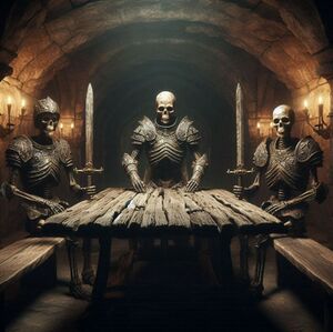 A borzalmas látványt maguk mögött hagyva két ajtót fedeztek, a terem egymással szemközti oldalaiba vájva. Az egyiket kinyitották. Egy étkezőben találták magukat, a szobában székek, hordók, dobozok szétszóródva, szemben hosszú, tömör fa asztal. Az asztal mögött három, életre kelt csontváz üres tekintete bámult rájuk vissza. Rozsdás vértjük megfáradt csörgésével indultak meg a kalandorok felé. Yara azonnal nyilat küldött feléjük, majd lábbal előre becsúszott az asztal alá, miközben Lyri kezét már jól ismert lángok hagyták el, célba véve az egyik élőhalottat. Jardin és Teshoms is támadásba lendültek, egyik kardjával, másik pörölyével sújtotta az ellent. Sypha is megpróbált csatlakozni a csetepatéhoz, ám a napok óta tartó szobrozás oly mértékben kimerítette, hogy egyetlen bűbájra volt csak képes, és az is erőtlenül süvített el az egyik csontváz mellett, majd szertefoszlott a szemközti falon. Hamarosan azonban a Száműzők maguk is eszközölték a problémát. Amikor a többiek már végeztek a másik kettővel, Teshoms az asztalról vetette rá magát az utolsó élőhalottra, és pörölyével röptében miszlikbe zúzta a rozoga csontokat.