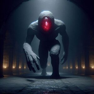 Ahogy közeledett feléjük, egyre kivehetőbbek voltak a fenyegetés vonásai: mintegy tíz láb magas, kőből faragott gólemmel találták magukat szemben, súlyos lépteinek hangját visszhangozták a falak. Emberszerűnek tűnt, de fején nem volt arc, csak az óriási, mágikus rubin virított belőle. Yara azon nyomban rálőtt a monstrumra, nyila azonban széttörve pattant le a sértetlen kőtömegről. Lyri ezt látva felemelte karját, s ujja végéből tűzcsóva villant fel. A gólem egy pár pillanatra megtántorodott, majd újra előrelépett. Arctalan tekintetét Teshomsra fordította, és a drágakőből felcsillanó fénnyel megbabonázta a bagabút, aki ezt pörölycsapással próbálta viszonozni, de hirtelen nagyon gyengének és dekoncentráltnak érezte magát. Jardin kivont karddal rontott rá az óriásra, de az túl keménynek bizonyult, eközben a klerikus keze ismét lángokat szórt ellenfelére. A szörnyvadásznak ekkor zseniális ötlete támadt: előkapta kötelét, és gyorsan körbeszaladt a gólem lábai alatt, majd Brachateshnek dobta a kötelet. A két harcos a kötélnek feszült, és egy erős rántással kibillentette az óriást. Amaz kényszerűen előrevetette lábait, és rettenetes robajjal hanyatt vágódott. A két férfi nyomban ott termett a fejénél, és feszegetni kezdte a drágakövet, de hiába. Yara megérezte, hogy itt rá van szükség: rugóként (érted, rogue...) pattant elő az oszlop mögül, és egyenesen a többiek közé vetődött. Kését, melyet már a levegőben bukfencezve előre kivont, bedöfte a gólem fejébe, az ékkő alá, és egy visszhangzó kattanás kíséretében kipattintotta azt. Az ékkő a levegőbe röpült, és pördülve, fordulva a félszerzet lazán kitett tenyerében landolt. Fénye azonnal kialudt, a kőóriás - már csak óriási kő - pedig a földön maradt, élettelenül. Ahol korábban a mágikus rubin ragyogott, mély üresség tátongott az arctalan fejben.