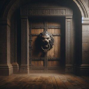 A bejáratul szolgáló, vaskos faajtó résnyire nyitva volt, odabentről nem látszott mozgás. Jardin gyengéden benyitott, mire az ajtó fáradtan nyikorogni kezdett, majd reccsent egyet, és nagy robajjal a padlóra zuhant. Amennyire kivehető volt a félhomályban, a hely évtizedek óta elhagyatottnak tűnt. - Megkockáztatok még egy kis fényt. - suttogta Lyri. Varázslata megvilágította a teret, de a fényben csak a tárgyakat beborító, emberöltő óta hízó porfátyol tükröződött vissza. Elindultak egy irányba, és rövidesen egy gyanús ajtóhoz értek, melyen méretes, oroszlánfejet formázó kopogtató díszelgett. Lyri előrelépett, kezébe vette a vadállat szájában lógó karikát, és háromszor kopogott vele. A fej életre kelt: az állkapcsa kinyílt, és szeme pislogott néhányat, majd így szólt: